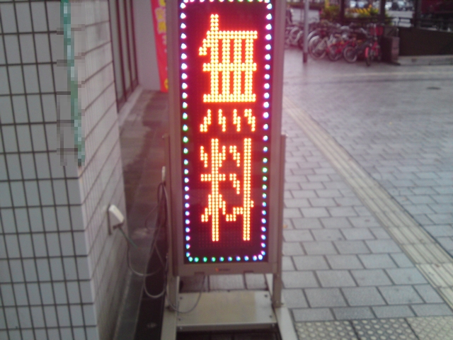 上記は、ビルの壁面に〝設置用の専用器具〟を用いて、たぶん最新型モデルの6文字1段タイプのLED電光掲示板で、「縦に文字を伸ばして3文字」表示している瞬間でしょうか。